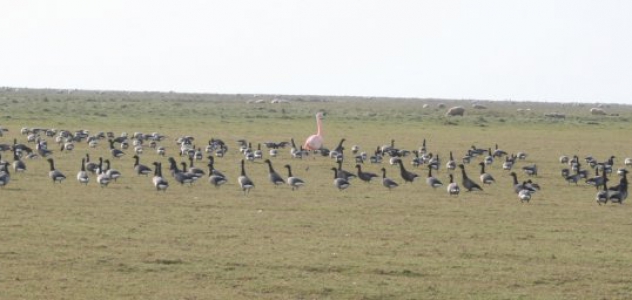 Image surprenante : un flamant rose au beau milieu des oies bernaches. Ce cliché rare a été pris cette semaine dans la baie du Mont Saint-Michel au pied de Genets, pas loin du Bec d'Andaine.