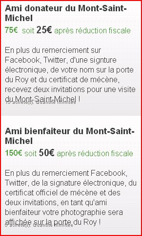 Pour symboliser votre participation et cette ouverture du Mont-Saint-Michel au mécénat populaire, en plus de bénéficier d'avantages fiscaux, vous pourrez retrouver votre nom ou photographie dans ce site emblématique, sur la porte du Roy, empruntée par plus de 3 millions de personnes chaque année !